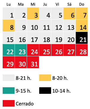 The schedule in October is Monday to Saturday from 8 a.m. to 9 p.m. and Sunday from 10 a.m. to 2 p.m., except for the following day: